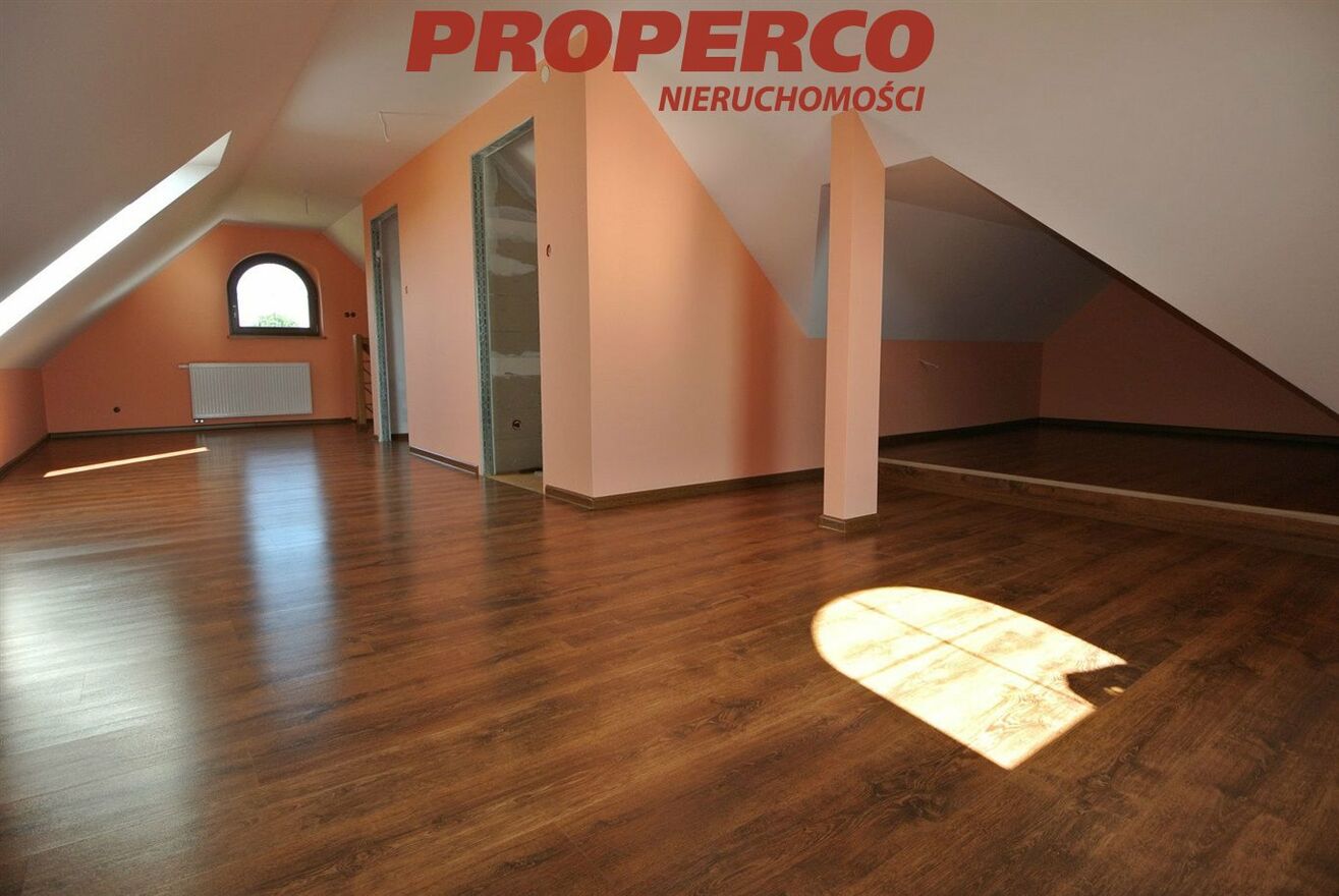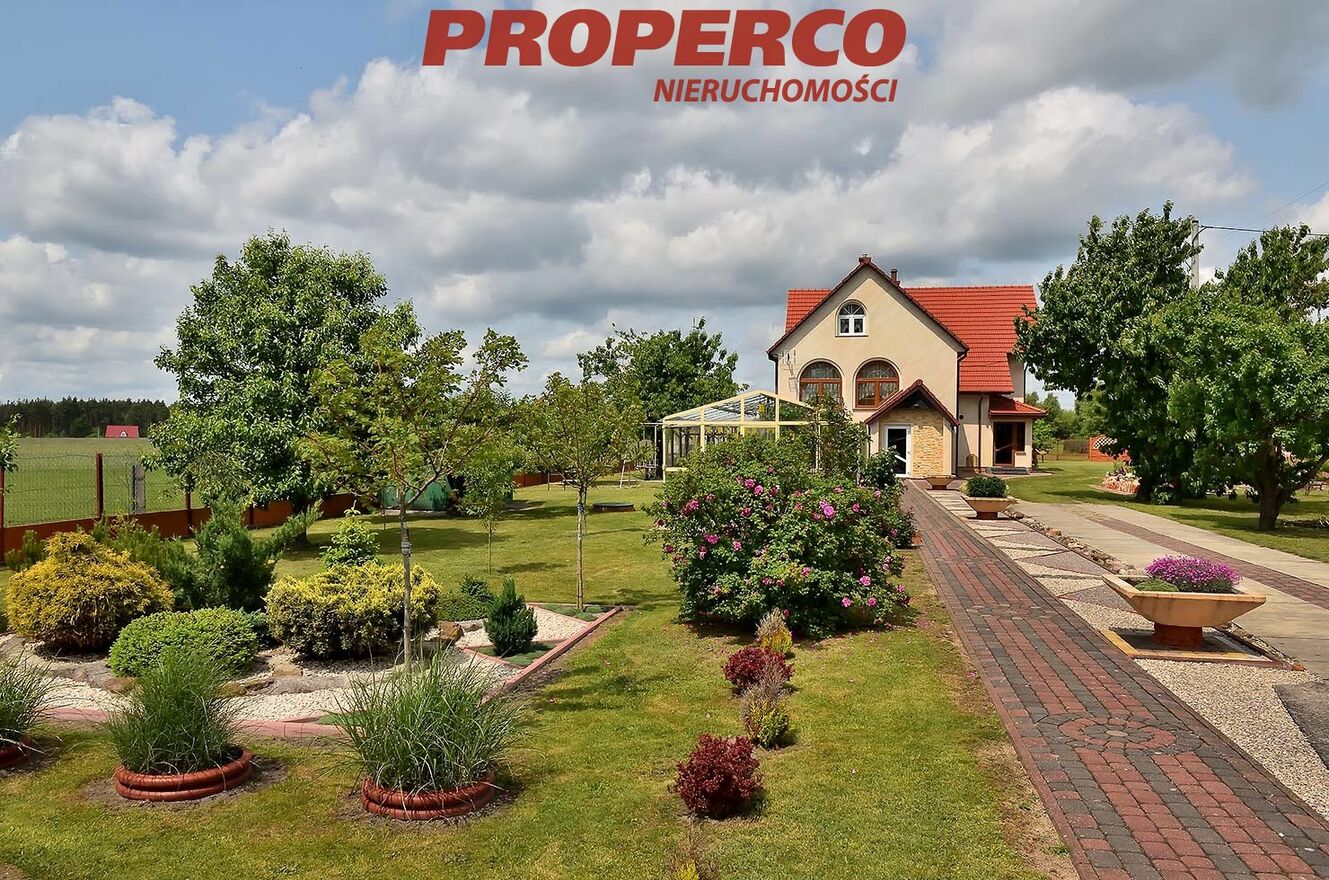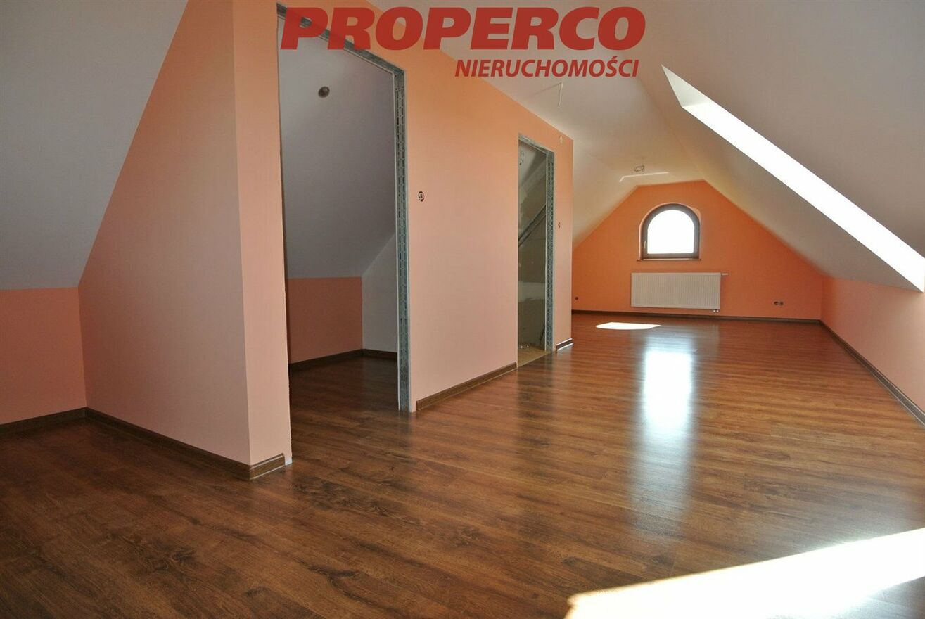 Część budowlana działki (ok. 3000 m 2 ) ogrodzona, brama otwierana na pilota, zadbany teren z oczkiem wodnym. Dojazd drogą asfaltową. Spokojna, cicha okolica z dobrym dojazdem do Kielc. W bliskiej odległości szkoła oraz przystanek komunikacji miejskiej